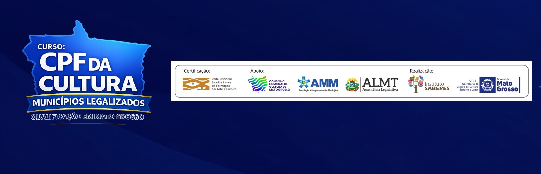 O curso de capacitação CPF DA CULTURA – MUNICÍPIOS LEGALIZADOS é uma iniciativa do Instituto Saberes em parceria com a Secretaria de Estado de Cultura, Esporte e Lazer de Mato Grosso (SECEL/MT), que visa capacitar gestores públicos, conselheiros municipais, artistas e fazedores de cultura para a estruturação dos componentes essenciais do Sistema Municipal de Cultura: o Conselho, o Plano e o Fundo de Cultura – o chamado “CPF da Cultura”. A formação é ofertada em formato online, por meio de um Ambiente Virtual de Ensino exclusivo, com aulas, materiais complementares, fóruns e suporte técnico-pedagógico.