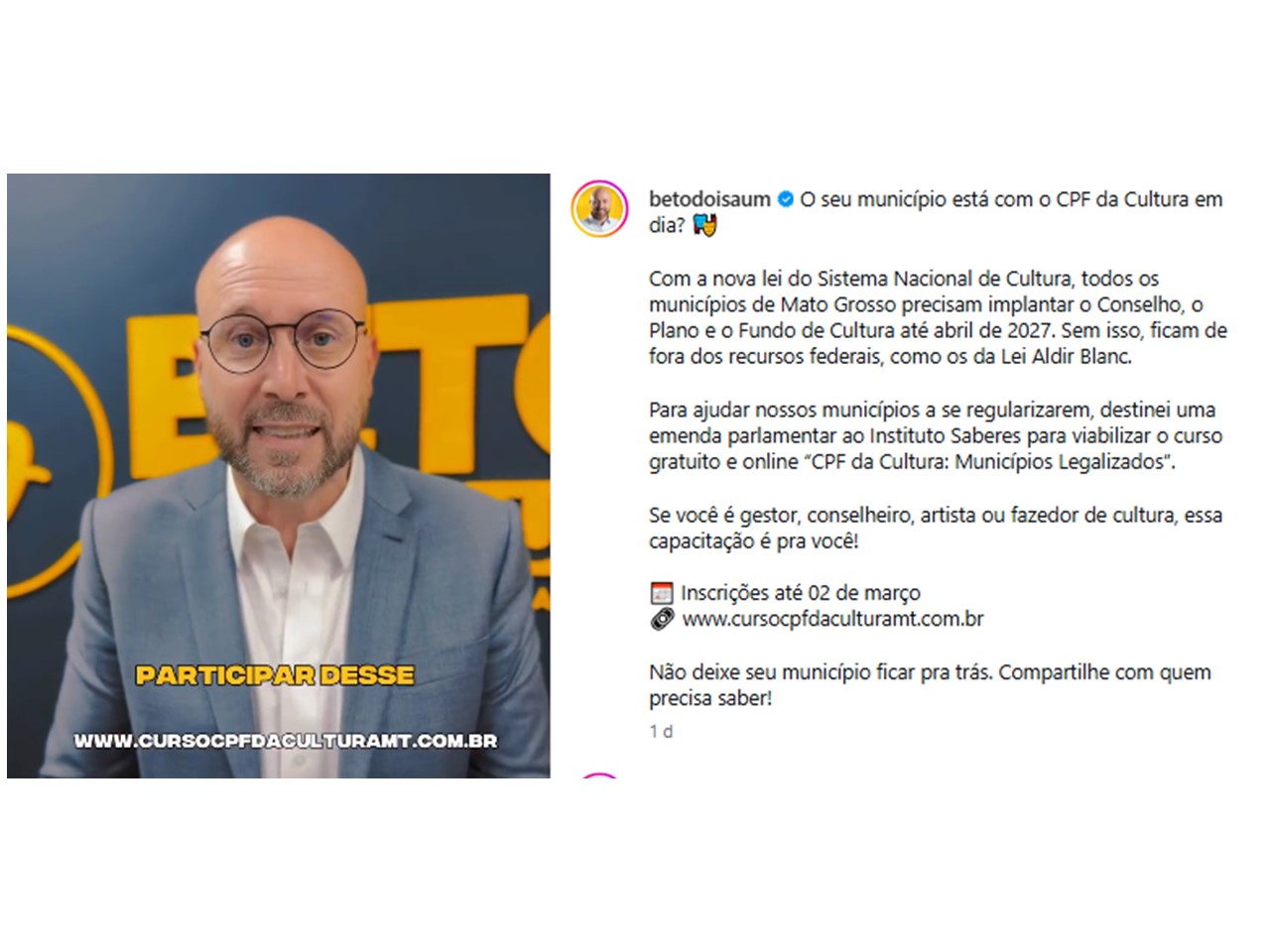 O Deputado Estadual Beto Dois a Um (PSB), autor da emenda que viabiliza o curso CPF DA CULTURA: MUNICÍPIOS LEGALIZADOS gravou vídeo convite que pode ser acessado pelo link: https://www.instagram.com/p/DVO3HxTD5BV/