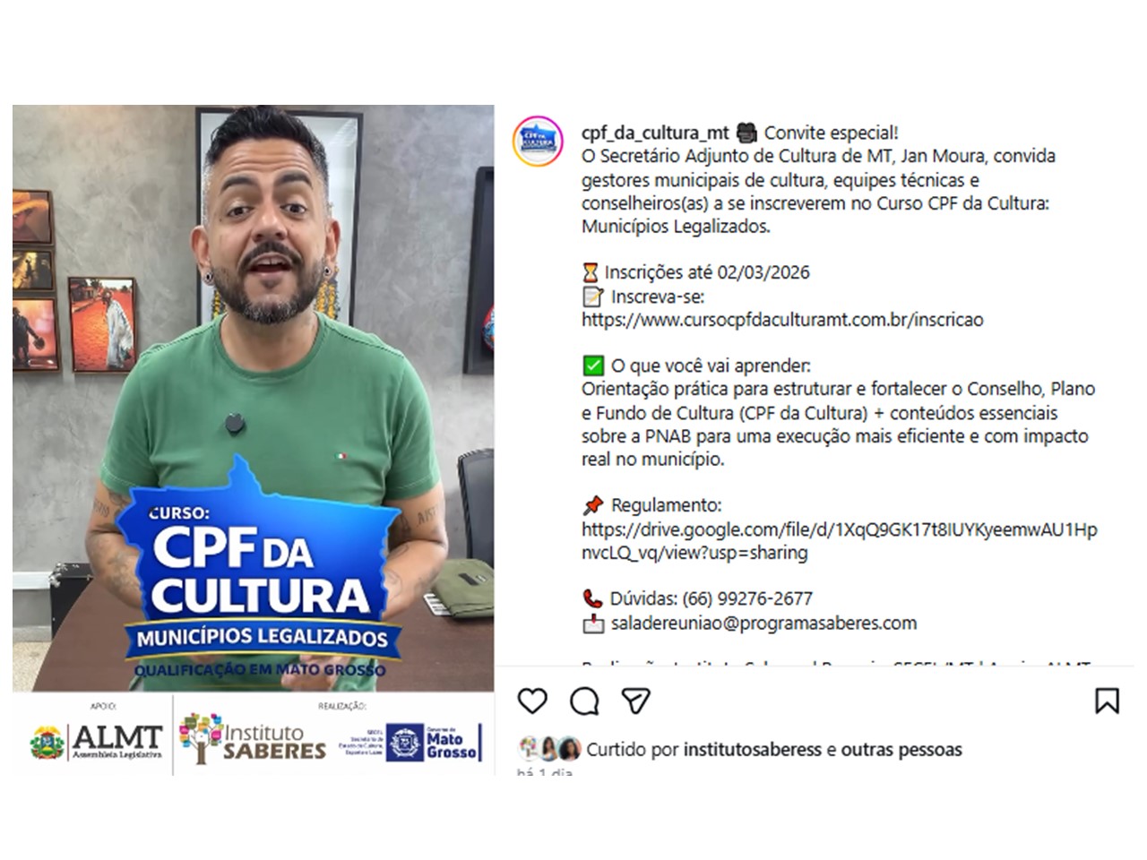 O Secretário-adjunto de Estado da Cultura, Jan Moura, gravou vídeo convite para inscrição para o curso CPF DA CULTURA: MUNICÍPIOS LEGALIZADOS que pode ser acessado pelo link: https://www.instagram.com/p/DVNq2j0jhuV/